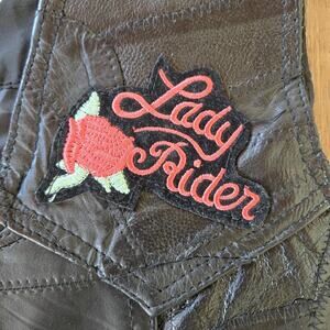 Decorations: Sewn-on patches including "Lady Rider" with rose, "Born to Be Wild," "Deal with It! Girls Ride too," "It Aint Easy To Be Me," large back patch "Love to Ride," "I'M PERFECT JUST THE WAY I AM," "I'M NOT SPOILED... I'M JUSTLY REWARDED!," "Life is Good," and "Smoky Mountains"
