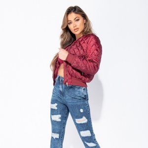 Introducing the Diamond Quilted Bomber Jacket in a rich Wine color.