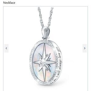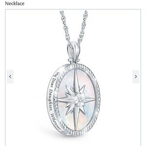 Solid sterling silver necklace with genuine diamond, sculpted compass design, mother of pearl inlay. Engraved message along outer edge. Gift box.