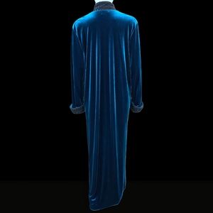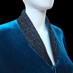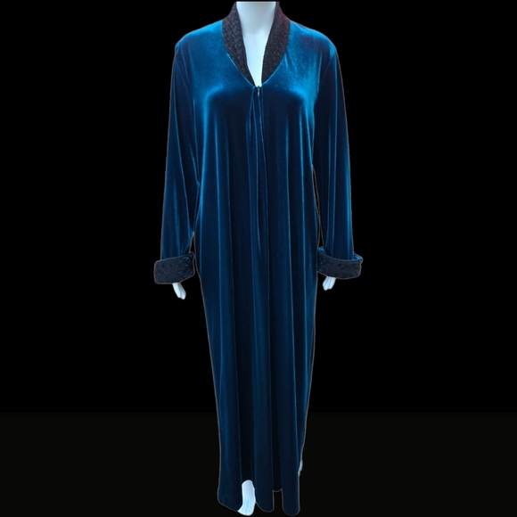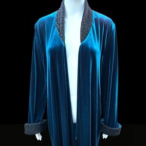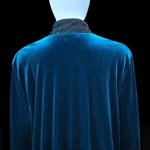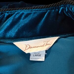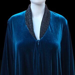 Luxurious Diamond Tea robe from Neiman Marcus in a rich velvet-like fabric that shifts between deep teal and sapphire blue depending on the light. Elegant, cozy, and beautifully made — perfect as a glamorous lounge robe or house coat.