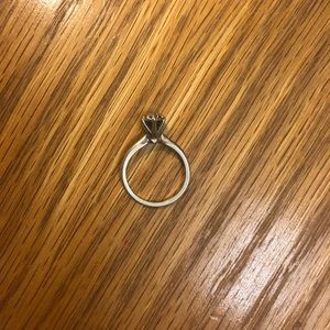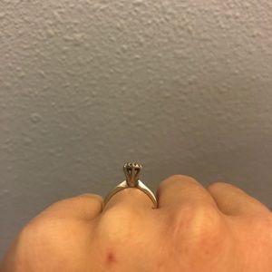 10k white gold with seven small diamonds in the center, approximately size 5.5. This ring is so pretty, I just don’t have any use for it!