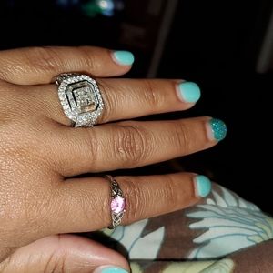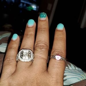 Beautiful 14 WG thick band has rounds, baguettes & princess cut diamonds.