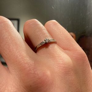 Unsure about diamond carat, color etc. This was a gift from a small jewelry store. Purchase price was about $350. Authentic diamond and 10k white gold. Size 7