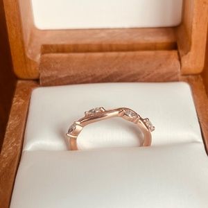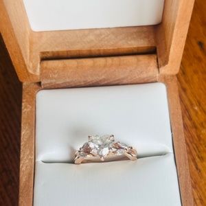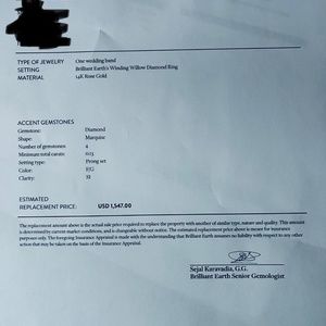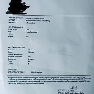 The lab-created heart shaped diamond is surrounded by eight beautiful ivy shaped diamonds, and the entire set is made of 14k rose gold. The ring has a solitaire with accents setting style and a band width of 4.5mm.
