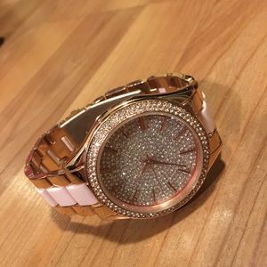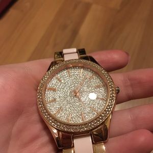 Rose gold bedazzled watch. Perfect for every girly girl. Has minor Scratches and/or scuffs. Battery is dead, needs a new one, might have a magnetic damage? Or it just died.