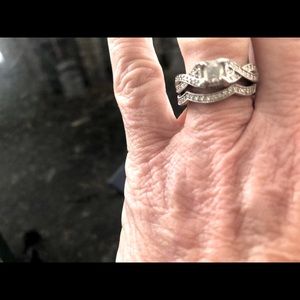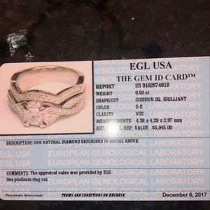Beautiful cross over ring with matching band. EGLCertification included. Square cushion cut set in platinum with surrounding pave stones
