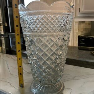This stunning vase features a sophisticated diamond lattice pattern that beautifully reflects light, enhancing its crystal hues. Its tall, slightly flared shape and scalloped rim make it a perfect centerpiece for any table. Crafted with a sturdy pedestal base, this vase is both elegant and durable. Perfect for your favorite spring and summer bouquets!