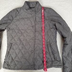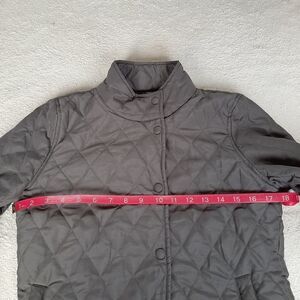 Pre-Owned grayish Soft Warm button down diamond quilted patterned jacket. It has 2 pockets with cool rings for the zippers and a cool Koala Bear pattern on the inside. The brand tag is missing, so I'm not sure of that. Approx measurements are pictured.