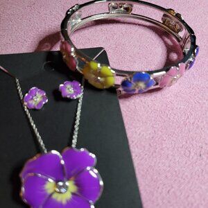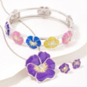 This Diamonique jewelry set will add a touch of spring and summer to your collection. It includes pansy earrings, a bracelet, and a pin/pendant with a chain. Each piece features vibrant colored enamel petals and a cubic zirconia Diamonique simulated diamond in the center.