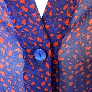Sheer blouse with a vibrant blue and orange pattern. Features a stylish button detail. Roll tab sleeves high low hemline long sleeves patch pocket