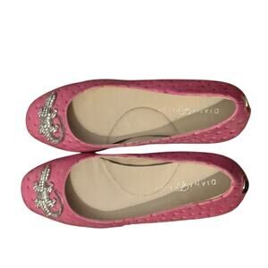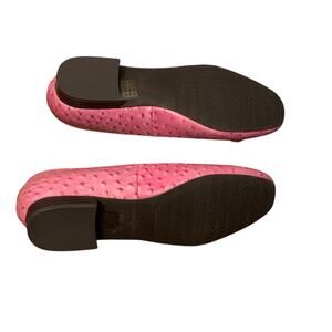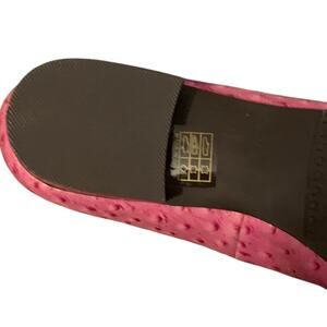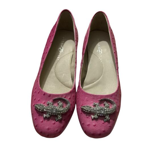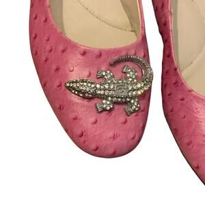 Spectacular ostrich embossed leather flats from Diana E. Kelly! Features a sparkly rhinestone alligator brooch affixed to the front of the shoe. Slip resistant outsole.