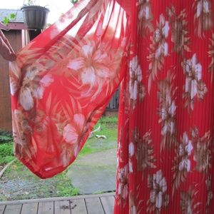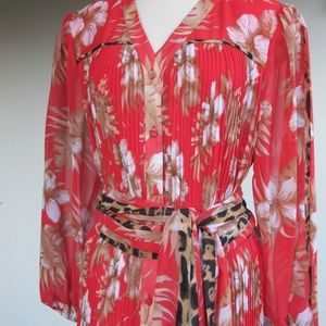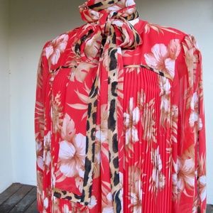 Pretty red-orange with tropical flowers in white, tan and light brown. Leopard print inset on sleeve, on bodice piping and on scarf/sash contrast.