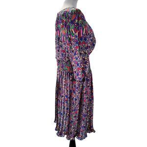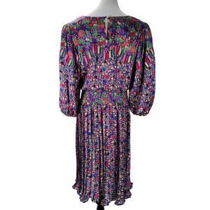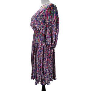 Vintage 80's pullover midi length dress features a wide smocked waist, 3/4 length puff sleeves with elastic cuffs, and a pleated skirt. Purple main with multicolor floral print and stripe accent across the bust. Shadow stripe fabric. Does not have shoulder pads but does has a stiff fabric to add volume. No dry rot in elastic.