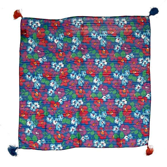 Authentic, preowned, vintage Diane Freis Scarf or shawl with tassels. No content label/chiffon fabric/recommend dry clean only. Preowned/vintage with minimal signs of prior wear: slight scent of fragrance. Measures approximately 30in square. Tagged DIANE FREIS
