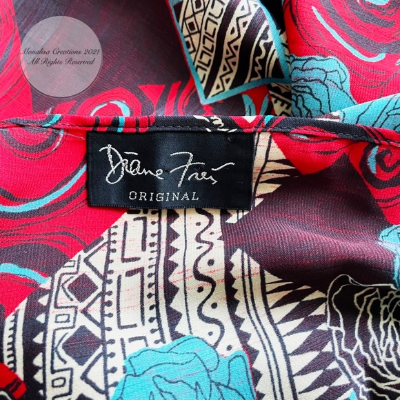 Authentic, preowned, vintage Diane Freis scarf or shawl with tassels, likely made in the 80s. No content label/feels like silk/dry clean recommended. Measures appx 30in H x 28in L. Preowned/vintage with minimal signs of prior wear.