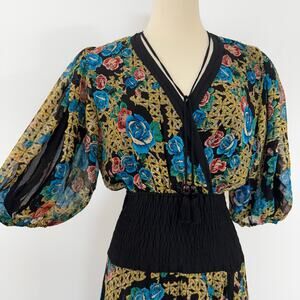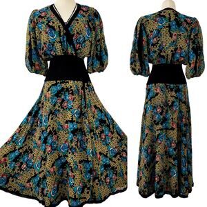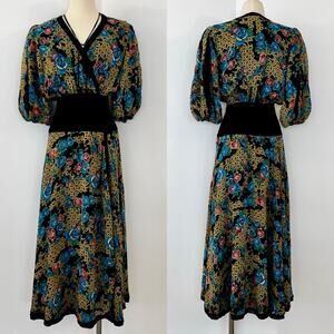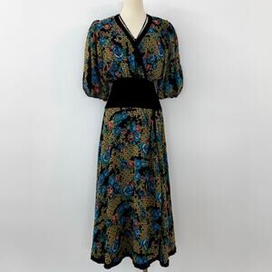 Diane Freis Silk Georgette Midi Dress Black Floral Multicolor Balloon Sleeve M/L