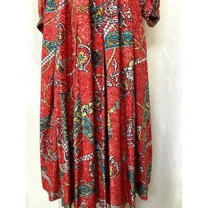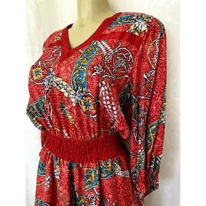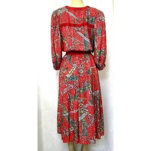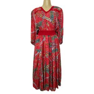Diane Freis Silk Midi Dress Red Pearl Print 3/4 Sleeve V Neck Elastic Wa…