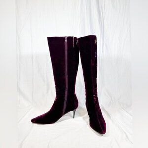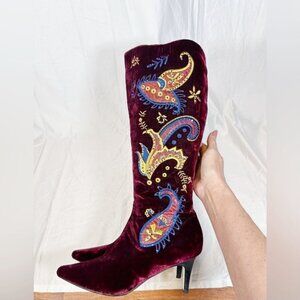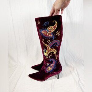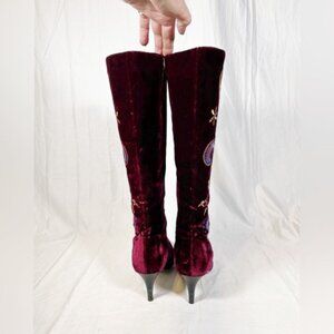 Diane Gilman Burgundy Velvet Rhinestone Embroidered Knee High Pointy Boots~8~