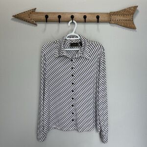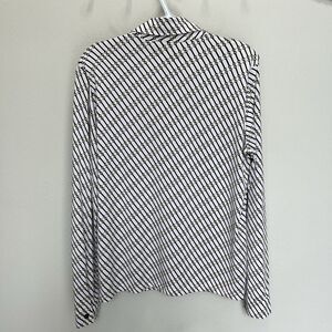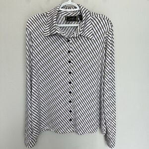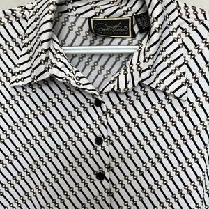 Add a touch of elegance to your wardrobe with this Diane Gilman Collection button top. Featuring a beautiful horse bit chain print, this blouse is perfect for any occasion, from workwear to casual outings. The collared neckline and button cuffs add a classic touch, while the long sleeves and jersey fabric make it suitable for all seasons.