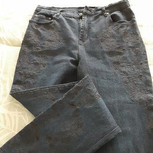 Diane Gilman Denim Stretch embroidered Jeans - Size 10T. Straight Leg. Navy blue denim jeans embroidered with black flower design on the front and down the side of the legs. Brief amount of embroidery shows on the back side of the pants....(see last 2 photos). Jeans are in excellent condition from a non-smoking home.
