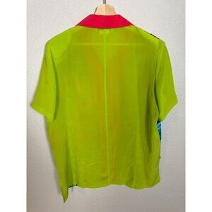 The Diane Gilman Silk Blouse Button Down Top in size large features a colorful tropical dolphin design with sequin accents. Made from 100% silk and with short sleeves and a collared neckline, shoulder pads, this blouse offers a comfortable and stylish fit for women looking to add a touch of art to their wardrobe.