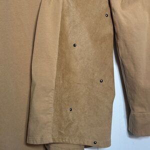 Chic tan long sleeve top of Faux Suede with stylish stud details. Perfect for versatile wear.