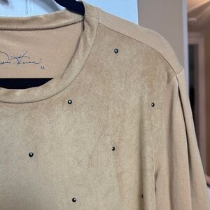 Diane Gilman Tan Faux Suede Mixed Media Long Sleeve Top with Stud Accents