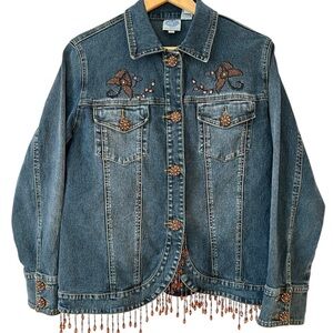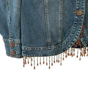 Diane Gilman Women’s Denim Funky Boho Jacket Rhinestone Buttons Beaded Fringe