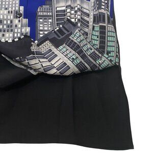 A visually captivating button-up shirt featuring a cityscape design on a rich blue and black silk fabric. This Diane Gilman piece combines elegance and creativity, making it an eye-catching addition to any wardrobe. The silk material offers a lightweight and comfortable wear, suitable for various occasions.