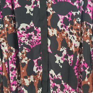 Chic and stylish Diane Von Furstenberg blouse with a striking cheetah splash print in pink. Features a button front closure, sheer fabric, and a fashionable high-low hemline. Perfect for elevating your wardrobe with a touch of elegance and sophistication.