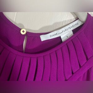 Diane Von Furstenberg 100% Silk Kaley Lily Crepe Sleeveless Purple Blouse Women’s Size 4. Has a back keyhole with a single button closure. Shell: 100% Silk. Lining: 100% Polyester. Dry clean only.