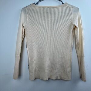 Chic cream top with intricate black lace detail. Ideal for a stylish look. Size P. Perfect condition. Very soft. Long sleeve or sweater