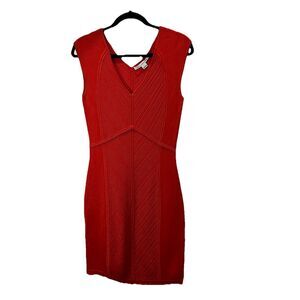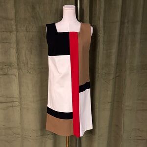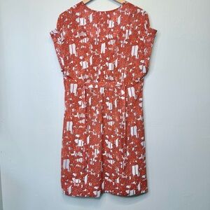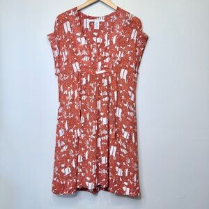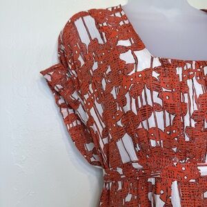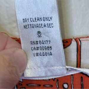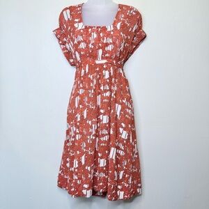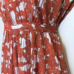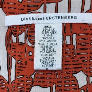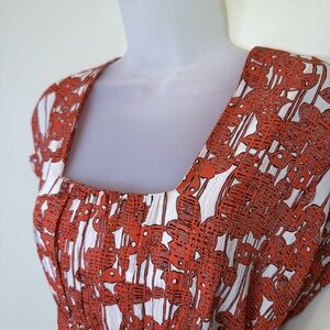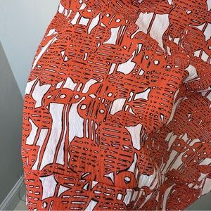 Elegant silk dress with a striking tomato red orange and white design. Ideal for any occasion.
