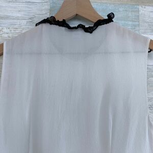 Design Features: Sheer Chiffon, Sleeveless, Round Collar Ruffle Trim, Pleated Pintuck Smocked Bib Front Button Placket, Lined, Straight Hem, Pullover, Flowy Silhouette, Dressy, Business Casual, DVF