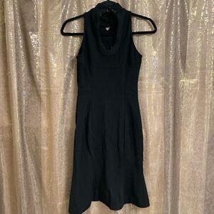 Super classy and perfect for any business casual setting. Smoke and pet free home. DVF is a high end brand and this dress was probably $300 or more when first sold. Wool, Nylon and Spandex materials. It does have a little bit of stretch to it but not a ton. Fully lined. Perfect little black dress.