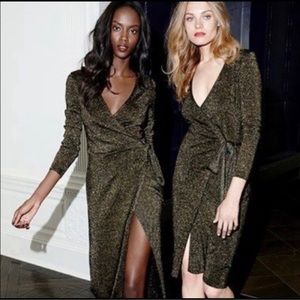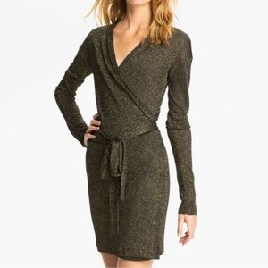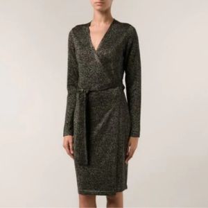 Diane Von Furstenberg Black & Gold Lurex Wool Evelyn Wrap Knee-Length Dress