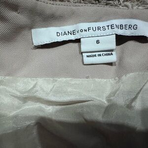 The Diane Von Furstenberg mini skater skirt showcases a stylish pleated design in a classic black and tan color scheme. Ideal for both work and casual settings, this skirt offers a structured and fashionable look with its neatly arranged pleats. Its versatile style makes it a must-have piece for any wardrobe.