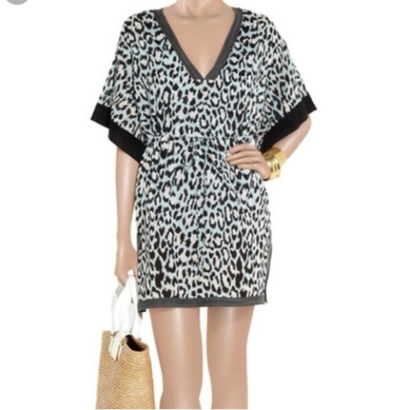 Embrace effortless elegance with this Diane Von Furstenberg swim coverup, featuring a striking black and white animal print. The V-neckline and kimono-style sleeves add a touch of sophistication, while the loose tunic silhouette ensures comfort and style for your beach outings. Has cinch detail at waist.