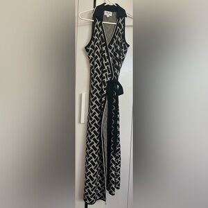 This elegant dress by Diane Von Furstenberg features a striking black and white geometric pattern, offering a sophisticated and modern look. The sleeveless design with a V-neckline and a waist-defining tie enhances the silhouette, while the full-length, wide-leg cut adds a touch of drama. Crafted from a soft, flowing fabric, this piece ensures comfort and style for any occasion.
