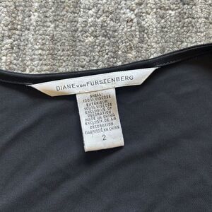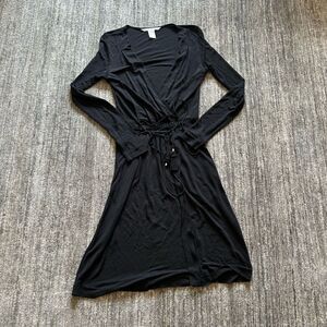 Diane Bon Furstenberg black wrap dress with tassel ties. Size 2. 100% viscose, great for travel. Classic dress. Excellent condition except for a few small snags on the cuff as shown in last photo. Priced to reflect.