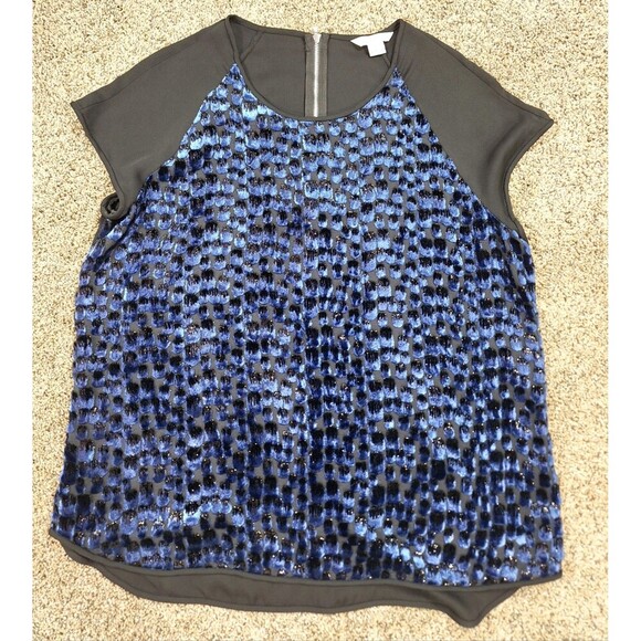 The Diane Von Furstenberg Blouse in size Large features a geometric pattern of black, blue, and gold accents on a velvet fabric with glitter detailing. This short sleeve blouse with a round neckline is versatile for various occasions including party, casual, workwear, and business. Made from a blend of silk, nylon, and rayon, it offers a comfortable fit with a regular style and is suitable for all seasons.