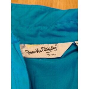This Diane Von Furstenberg blouse top is a must-have for any fashion-forward woman. The shirt features a button-up closure, collared neckline, and roll tab sleeves, making it an ideal choice for any occasion. The solid pattern in teal color is perfect for adding a pop of color to any outfit.