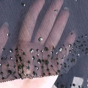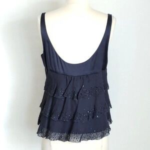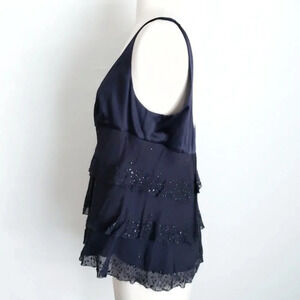 Navy blue tiered ruffles of sheer ribbed chiffon with beading. Low-cut scoop-neck in front and back. Oversized fit. Empire waist. DVF style Latiera. Sleeveless. Dry clean only. 100% silk