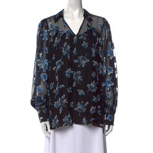 Diane Von Furstenberg Blue Floral Orchid Silk Burnout Long Sleeve Blouse V Neck