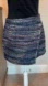 A Line mini skirt with a structured, straight silhouette. It’s made from a multi-colored boucle/tweed-style fabric featuring horizontal woven stripes in shades of dark navy, black, hints of metallic silver, and subtle pops of pink or purple. The texture is slightly nubby, giving it a rich, dimensional look typical of tweed or boucle weaves.