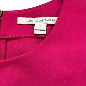 This stunning sleeveless mini dress by Diane Von Furstenberg features a vibrant pink hue, perfect for a cocktail night out. Its classic sheath silhouette and crew neck design offer a timeless elegance, while the smooth, structured fabric ensures a flattering fit.