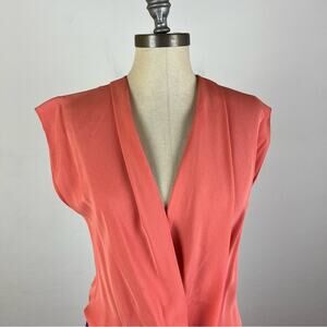 Great used condition. Size 2. Has a stain on the back, no rips or tears. 100% silk, sleeveless, drape v neck. C2
