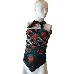 80’s DVF Vibrant large 42.5” square scarf featuring paisley and plaid patterns. Colors include black, white, red, turquoise and pink. This silk scarf is from her Color Authority era and it’s large enough to wear as a top. sash belt, head wrap or scarf!