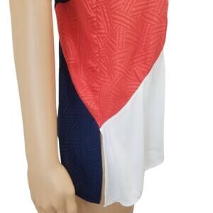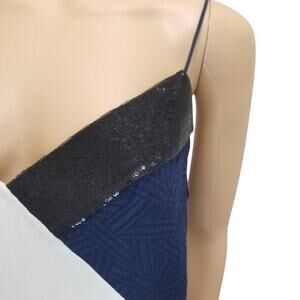 Silk spaghetti strap tank top. Beautiful micro sequin black panels. Textured salmon pink and blue panels. Un-even hemline. Slit on right side of top (longest side).