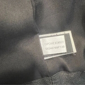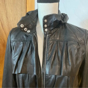 Cute Lambskin long sleeve tiered ruffle bomber jacket. It has a snap front standup collar with a ruffled back. Hidden front zipper, cropped hem and pleated tiers on front and back. In excellent worn condition. Approximate measurements laying flat: bust 18” across from armpit to armpit, sleeve length 25” and length 22”.